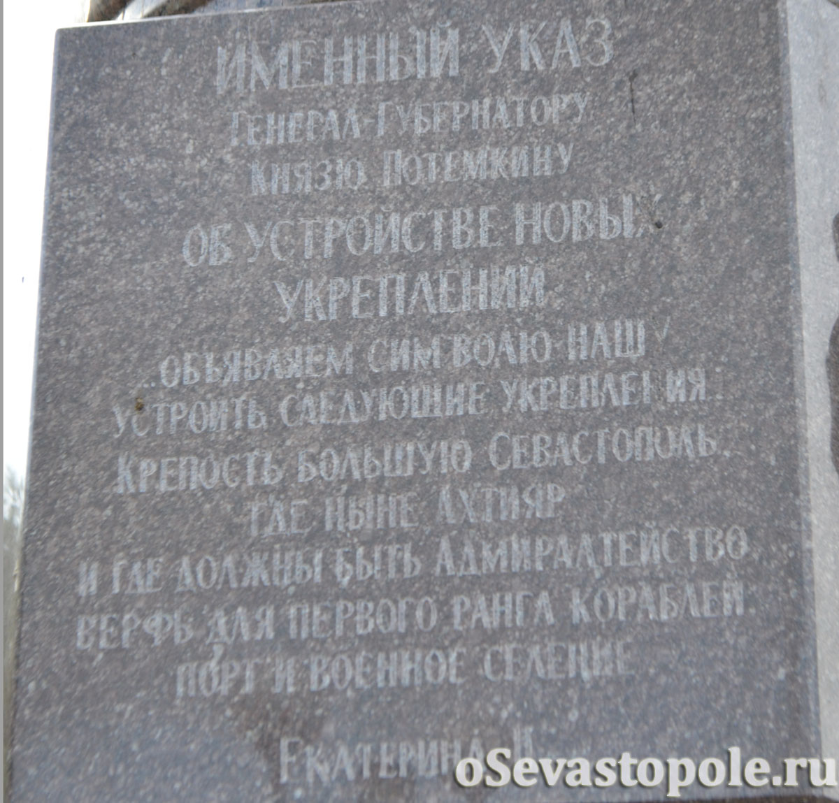 Указом Екатерины II от 10 февраля 1784 г. город получил имя Севастополь. Этим же Указом князю Г. А. Потемкину предписывалось построить в Ахтиарской гавани большую крепость с адмиралтейством для кораблей первого ранга, а также порт и военное поселение.