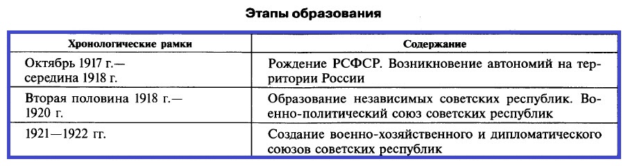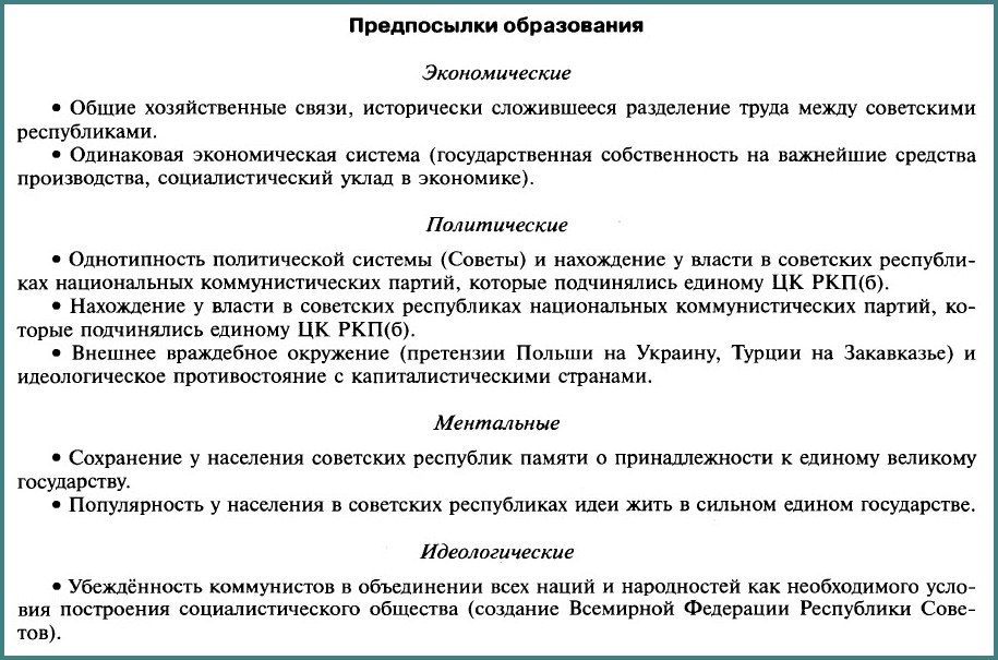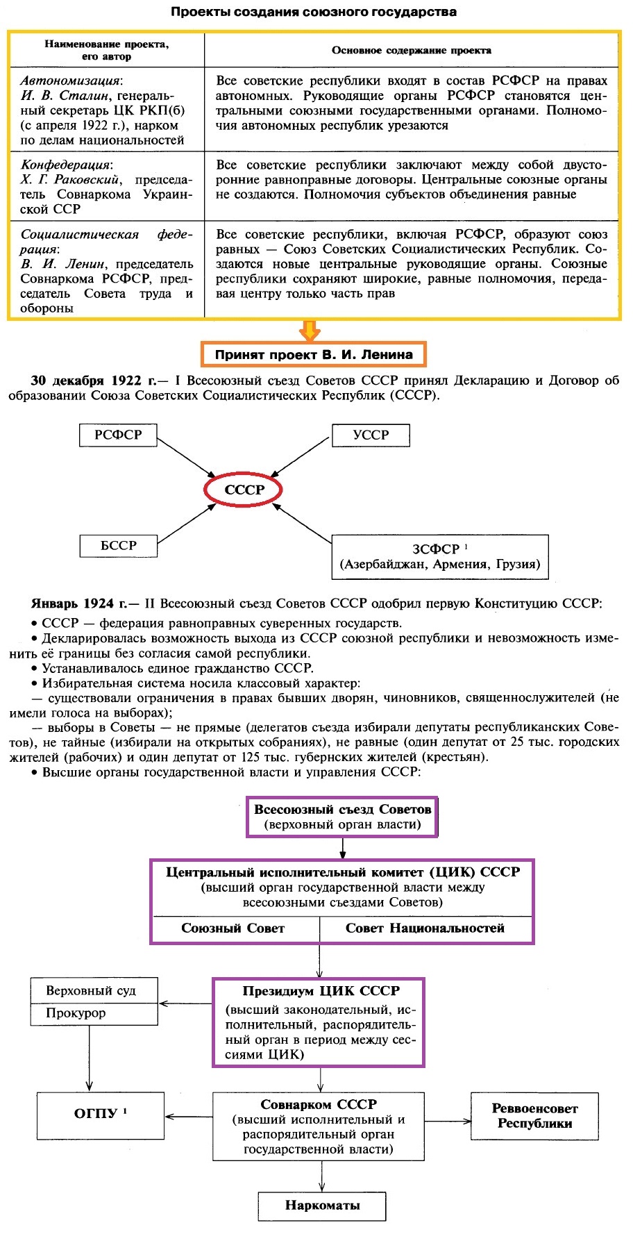 Партийные лидеры искали все больше путей для сближения республик, в итоге делегатов от республик начали приглашать на Всероссийские съезды Советов и Всероссийского Центрального Исполнительного комитета (ВЦИК). Как результат – высшим органам власти РСФСР пришлось играть сразу в двух ролях: и республиканским органом власти, и общефедеральным центром. Общие законы отсутствовали, поэтому акты, подписанные республиканскими высшими органами власти, только лишь утверждали декреты, принятые РСФСР.Со временем все республиканские государственные аппараты стали подобными принятому в РСФСР. В г. Москва появились республиканские представительства.В 1922 г. трудящиеся стали организовывать массовые выступления за провозглашение единого союзного государства. В марте провозгласили Закавказскую федерацию, которая в конце того же года стала ЗСФСР. Центральный комитет (ЦК) партии тем временем разрабатывал мероприятия, касающиеся объединения республик. Иосиф Сталин предлагал идею автономизации. Такой вариант предполагал, что в состав РСФСР войдут суверенные советские республики с правом автономии. Часть партийных работников предложение поддержали, но Владимир Ленин и Октябрьский пленум отвергли предложение Иосифа Виссарионовича.В то же время Владимиром Лениным была разработана совершенно другая форма объединения. Именно он стал автором идеи создания новейшего государственного образования – Союза Советских Социалистических Республик. При этом варианте предполагалось наличие равных прав и у РСФСР, и у остальных республик.29 декабря 1922 г. состоялась конференция, на которой присутствовали делегации от РСФСР, Украины, Белоруссии и ЗСФСР. Именно там произошло подписание договора об образовании СССР. Участники провозглашали создание союза для уничтожения национального гнета и противостояния империалистам, для ликвидации Гражданской войны и начала восстановления строительства. Назывались и причины для формирования объединенного государства, в основном они касались внешней безопасности и общей нестабильности в мире.На следующий день, во время I Всесоюзного съезда Советов, произошло утверждение договора.