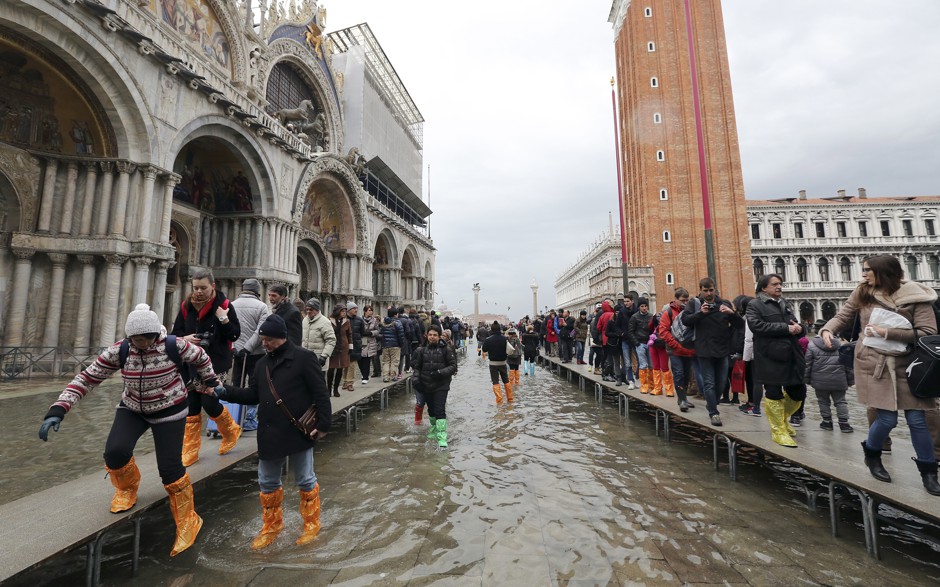 Рис. 10. Туристы идут по приподнятым мосткам на площади Святого Марка во время высокой воды