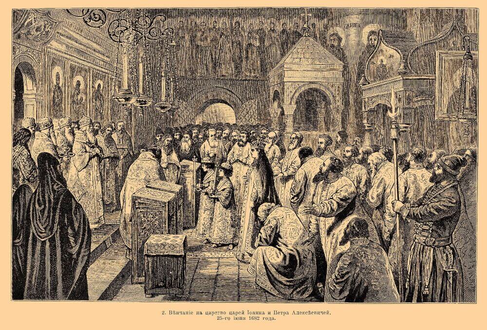 25 июня 1682 года, менее чем через два месяца после смерти Федора III, Иван и Петр были коронованы в Успенском соборе как соправители. По этому случаю был сооружен с двумя сиденьями (ныне экспонируется в Оружейной палате Кремля ). В то время как Ивану в это время было 16 лет, его соправителю Петру I было всего 10. Иван считался «старшим царем», но фактической властью в течение следующих семи лет владела Софья Алексеевна , сестра Ивана и сводная сестра Петра. годы.