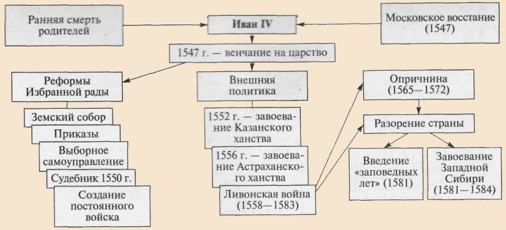 Иван IV стал великим князем Московским в возрасте 3 лет. Первоначально страной управляла его мать — Елена Глинская — в качестве регента, а после ее смерти в 1538 г. — кланы бояр. За время своего правления Иван Грозный инициировал структурные реформы государства, принял новый Судебник, развил концепцию царской власти, но в то же самое время царь подверг страну суровым испытаниям опричнины, которые многие историки склонны рассматривать, как причину хозяйственного разорения страны и Смутного времени.