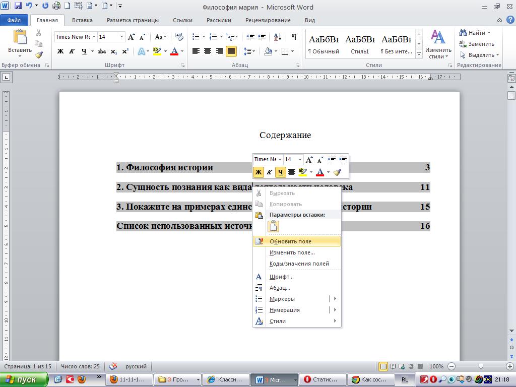 10. Далее спасаемся в низ реферата – подтягиваем все главы к началу страницы, все еще раз проверяем. 11. На всякий случай на сером поле «Содержания» нажимаем правую кнопку мыши. Нажимаем «Обновить поле».