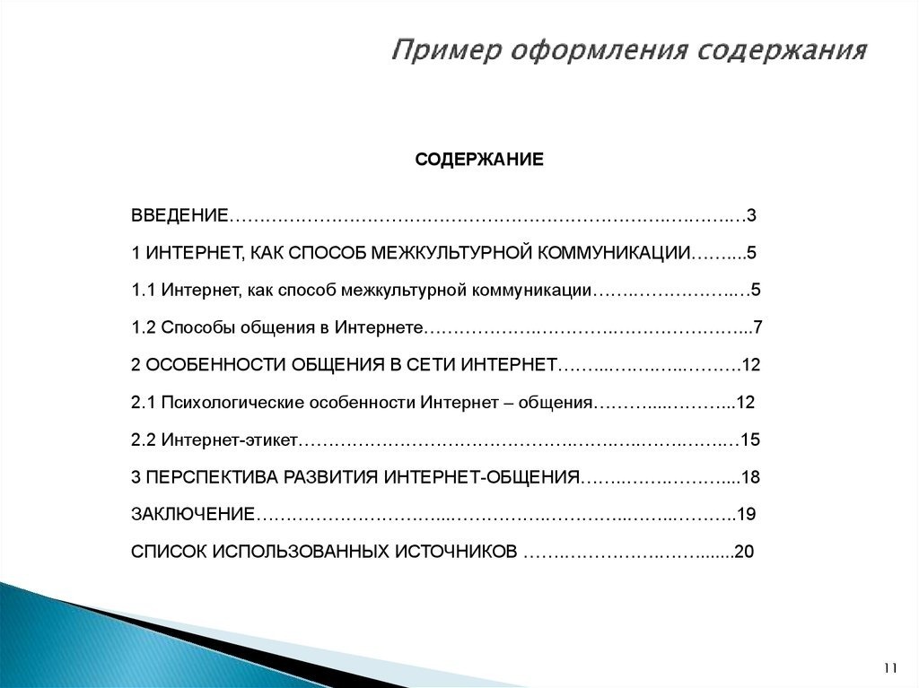Содержание — это план вашего доклада. Оно идет сразу после титульного листа. В нем списком перечисляются главы, разделы, указываются страницы.