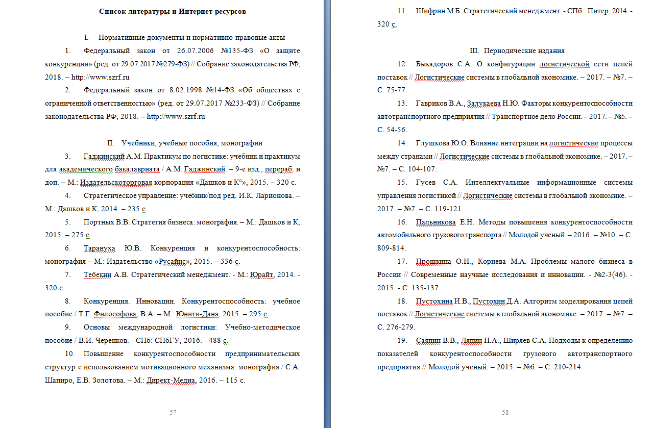 Книги: Автор И.А. Название книги: Учеб. пособие / Под ред. И.А. Фамилия. М., 2017. Автор И.А., Автор И.А. Название книги: Учебник / Под ред. И.А. Фамилия; 3-е изд., доп. и перераб. М., 2017. Автор И.А. Название книги: Учеб.-метод. пособие. В 3 т. / Под ред. И.А. Фамилия; 3-е изд., доп. и перераб. Т. 2. М., 2017. Журналы: Фамилия И.О. Название статьи // Название журнала. Год (2017). Номер (№ 25). С. 25—29. Газеты: Российская газета № 1. Год (2017). Дата (15 октября). Нормативные правовые акты: ФЗ от 21 марта 2012 г. № 65 «О …» // СЗ РФ. Год (2012). Номер (№ 54). Ст. (5). Если это авторская статья: Фамилия И.О. Название его статьи. URL://http://www.названиесайта |