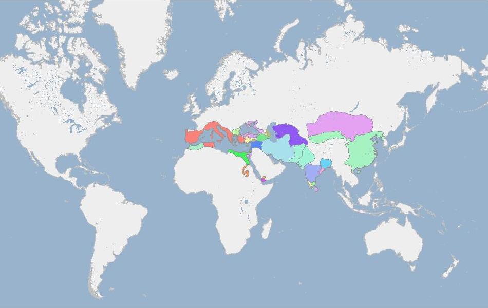 империи, голубой цвет — Парфянская империя, Китайская Империя династии Хань.