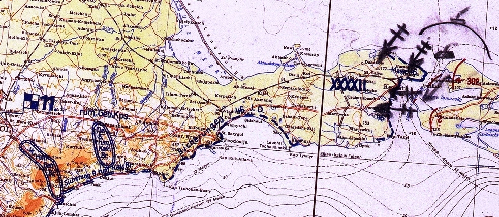 В дальнейшем, удерживать господствующие высоты 141,8-131,7-114,4 Чурбаш-Тат, отм. 120,7 ударить по группировке противника в Керчи.