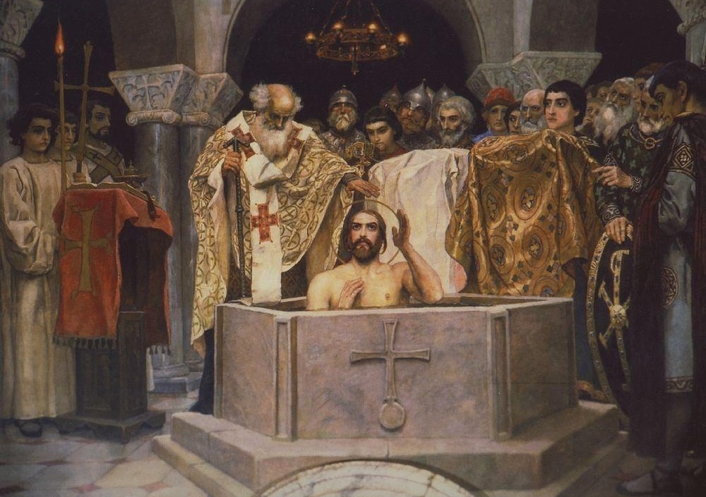 Крещение князя Владимира. В.М. Васнецов. 1890 год. Святое Крещение князь Владимир принял сразу же после осады Корсуни и перед женитьбой на царевне Анне