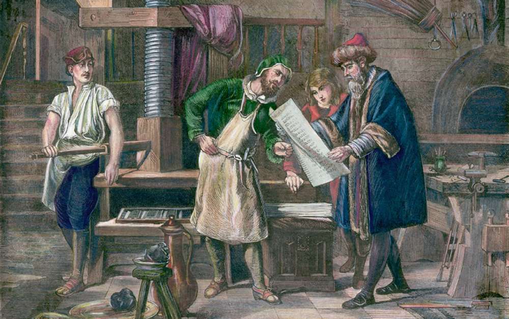 Официальной датой начала книгопечатания считается 1445 год, когда в Германии Иоганн Гутенберг изобрел печатный станок. До него книги переписывали вручную. Бумажный лист пристукивали к печатной форме гладким камнем, обтянутым кожей, или просто приглаживали ладонью.