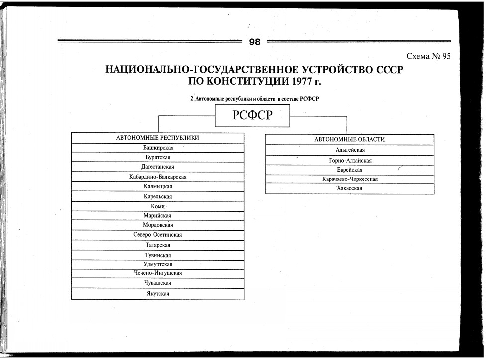 По Конституции 1977 года некоторые республики СССР включали в себя другие автономные области и республики. Так, РСФСР состояла из Башкирской, Бурятской, Дагестанской, Калмыцкой, Карельской, Мордовской, Марийской и других автономных республик.