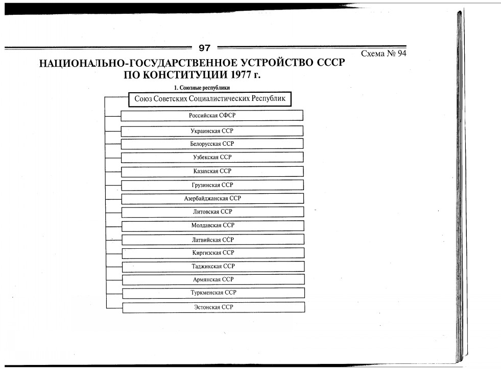 Советский Союз по Конституции 1977 года состоял из пятнадцати республик, единственной федеративной из которых была РСФСР. Крупнейшими национально-государственными образованиями оставались Российская СФСР, Украинская ССР и Белорусская ССР.