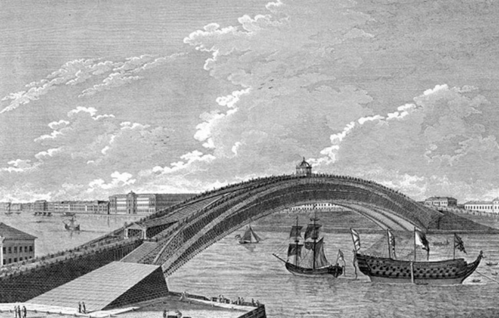 Знаменитый однопролетный мост через Неву — как он мог бы выглядеть, если бы был построен. Его расчет Кулибин выполнял на моделях, в том числе в масштабе 1:10.