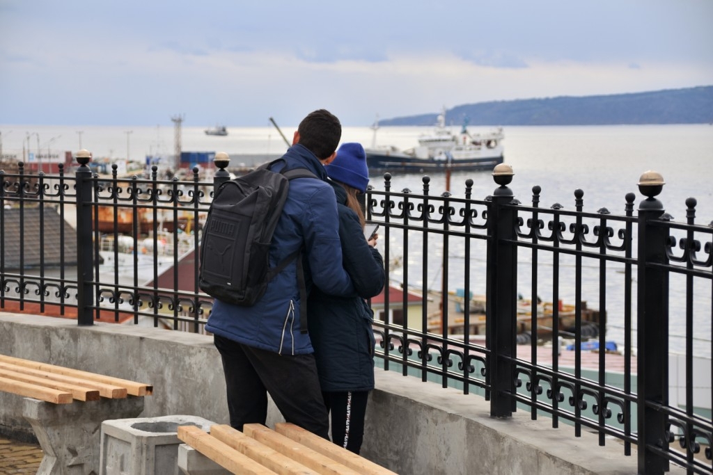 Благоустройство территории (на фото: новенькая смотровая площадка с видом на бухту и вулкан Менделеева)