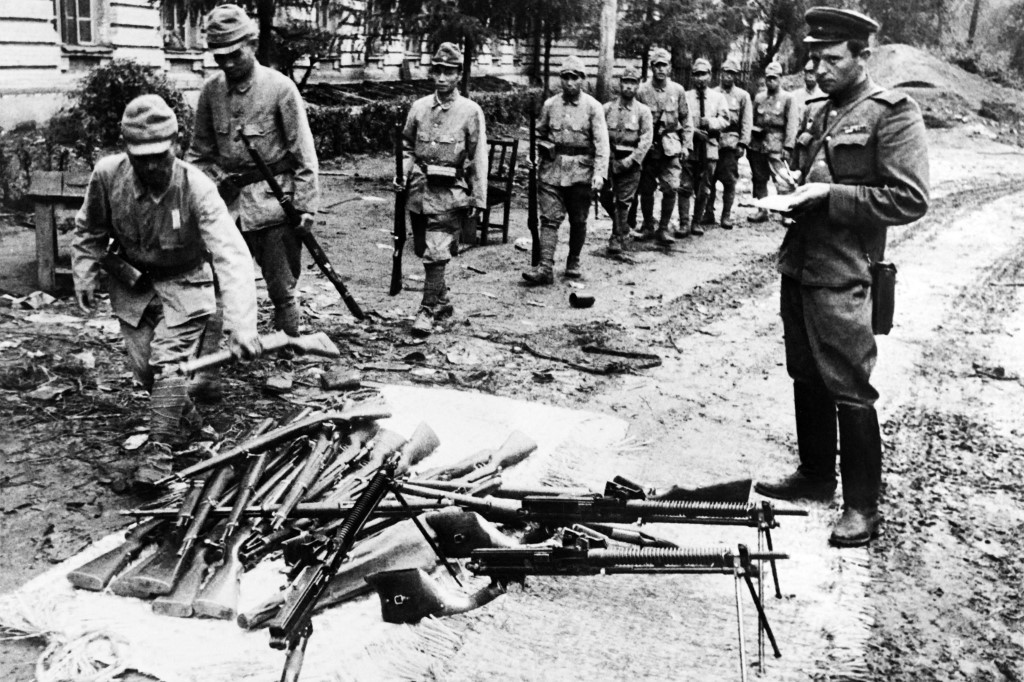 - Японские солдаты складывают оружие перед советскими офицерами