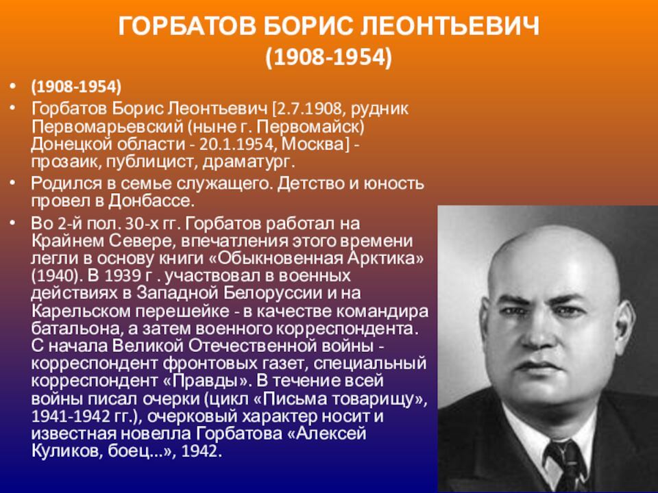 (1908-1954)Горбатов Борис Леонтьевич — прозаик, публицист, драматург.Родился в семье служащего. Детство и юность провел в Донбассе. Во 2-й пол. 30-х гг. Горбатов работал на Крайнем Севере, впечатления этого времени легли в основу книги «Обыкновенная Арктика» (1940). В 1939 г . участвовал в военных действиях в Западной Белоруссии и на Карельском перешейке — в качестве командира батальона, а затем военного корреспондента. С начала Великой Отечественной войны — корреспондент фронтовых газет, специальный корреспондент «Правды». В течение всей войны писал очерки (цикл «Письма товарищу», 1941-1942 гг.), очерковый характер носит и известная новелла Горбатова «Алексей Куликов, боец…», 1942.