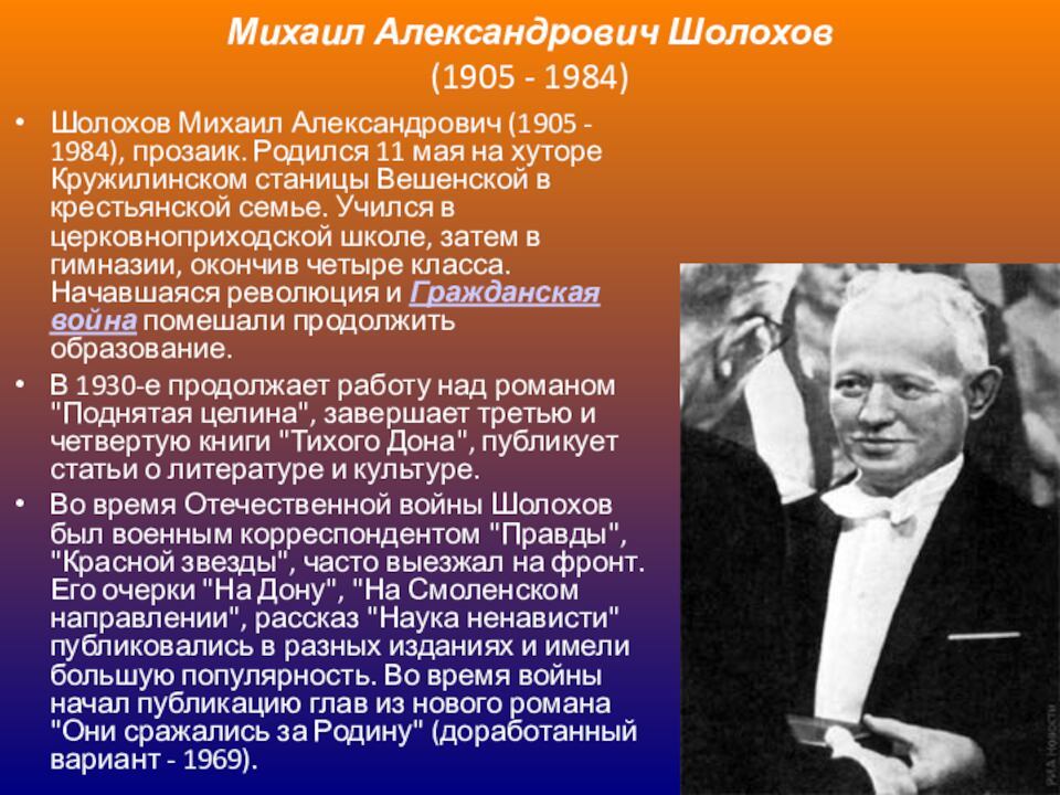 Шолохов Михаил Александрович (1905 — 1984), прозаик. Родился 11 мая на хуторе Кружилинском станицы Вешенской в крестьянской семье. Учился в церковноприходской школе, затем в гимназии, окончив четыре класса. Начавшаяся революция и Гражданская война помешали продолжить образование.В 1930-е продолжает работу над романом «Поднятая целина», завершает третью и четвертую книги «Тихого Дона», публикует статьи о литературе и культуре.Во время Отечественной войны Шолохов был военным корреспондентом «Правды», «Красной звезды», часто выезжал на фронт. Его очерки «На Дону», «На Смоленском направлении», рассказ «Наука ненависти» публиковались в разных изданиях и имели большую популярность. Во время войны начал публикацию глав из нового романа «Они сражались за Родину» (доработанный вариант — 1969).