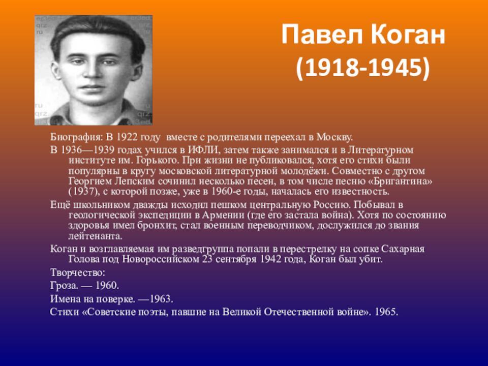 Биография: В 1922 году вместе с родителями переехал в Москву.В 1936—1939 годах учился в ИФЛИ, затем также занимался и в Литературном институте им. Горького. При жизни не публиковался, хотя его стихи были популярны в кругу московской литературной молодёжи. Совместно с другом Георгием Лепским сочинил несколько песен, в том числе песню «Бригантина» (1937), с которой позже, уже в 1960-е годы, началась его известность.Ещё школьником дважды исходил пешком центральную Россию. Побывал в геологической экспедиции в Армении (где его застала война). Хотя по состоянию здоровья имел бронхит, стал военным переводчиком, дослужился до звания лейтенанта.Коган и возглавляемая им разведгруппа попали в перестрелку на сопке Сахарная Голова под Новороссийском 23 сентября 1942 года, Коган был убит.Творчество:Гроза. — 1960.Имена на поверке. —1963.Стихи «Советские поэты, павшие на Великой Отечественной войне». 1965.
