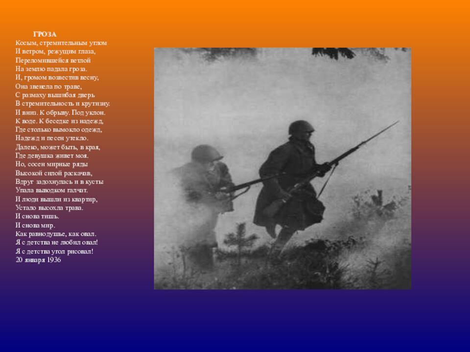 ГРОЗА Косым, стремительным угломИ ветром, режущим глаза,Переломившейся ветлойНа землю падала гроза.И, громом возвестив весну,Она звенела по траве,С размаху вышибая дверьВ стремительность и крутизну.И вниз. К обрыву. Под уклон.К воде. К беседке из надежд,Где столько вымокло одежд,Надежд и песен утекло.Далеко, может быть, в края,Где девушка живет моя.Но, сосен мирные рядыВысокой силой раскачав,Вдруг задохнулась и в кустыУпала выводком галчат.И люди вышли из квартир,Устало высохла трава.И снова тишь.И снова мир.Как равнодушье, как овал.Я с детства не любил овал!Я с детства угол рисовал!20 января 1936