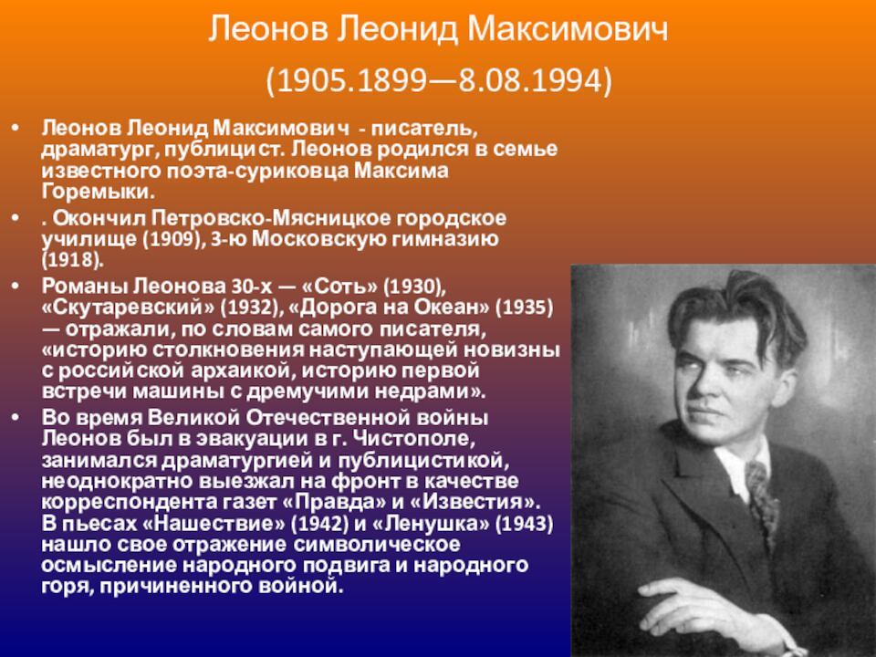 Леонов Леонид Максимович — писатель, драматург, публицист. Леонов родился в семье известного поэта-суриковца Максима Горемыки.. Окончил Петровско-Мясницкое городское училище (1909), 3-ю Московскую гимназию (1918). Романы Леонова 30-х — «Соть» (1930), «Скутаревский» (1932), «Дорога на Океан» (1935) — отражали, по словам самого писателя, «историю столкновения наступающей новизны с российской архаикой, историю первой встречи машины с дремучими недрами». Во время Великой Отечественной войны Леонов был в эвакуации в г. Чистополе, занимался драматургией и публицистикой, неоднократно выезжал на фронт в качестве корреспондента газет «Правда» и «Известия». В пьесах «Нашествие» (1942) и «Ленушка» (1943) нашло свое отражение символическое осмысление народного подвига и народного горя, причиненного войной.