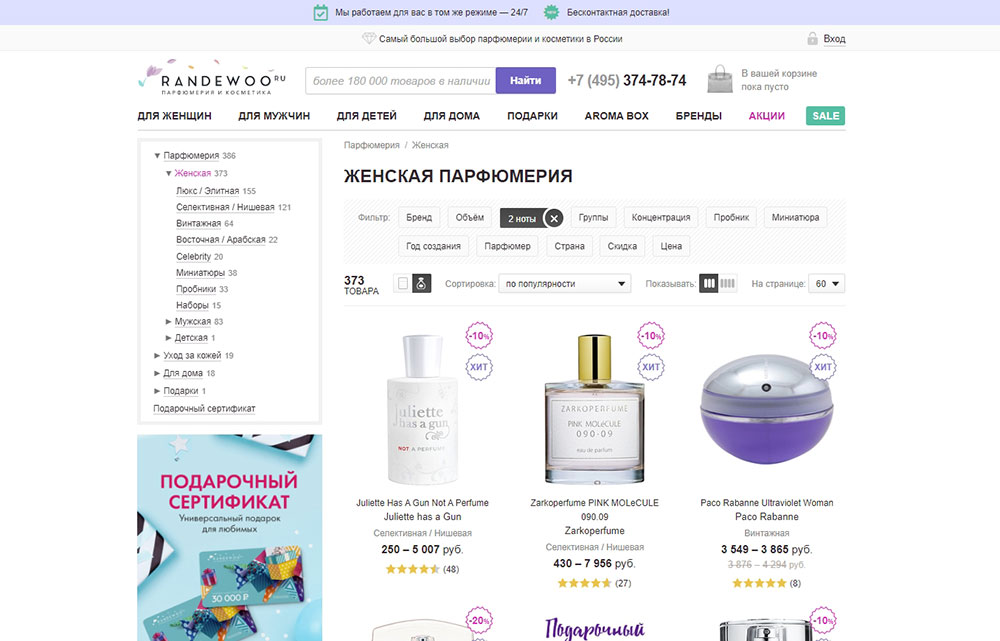Сами продукты размещены по категориям, брендам, нотам ароматов. Есть возможность заказать пробники объемом 1-3 мл.