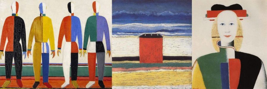 Картины Казимира Малевича. Слева: Спортсмены. 1932. Русский музей. Посередине: Красный дом. 1932. Там же. Справа: Девушка с гребнем в волосах. 1934. Третьяковская галерея.