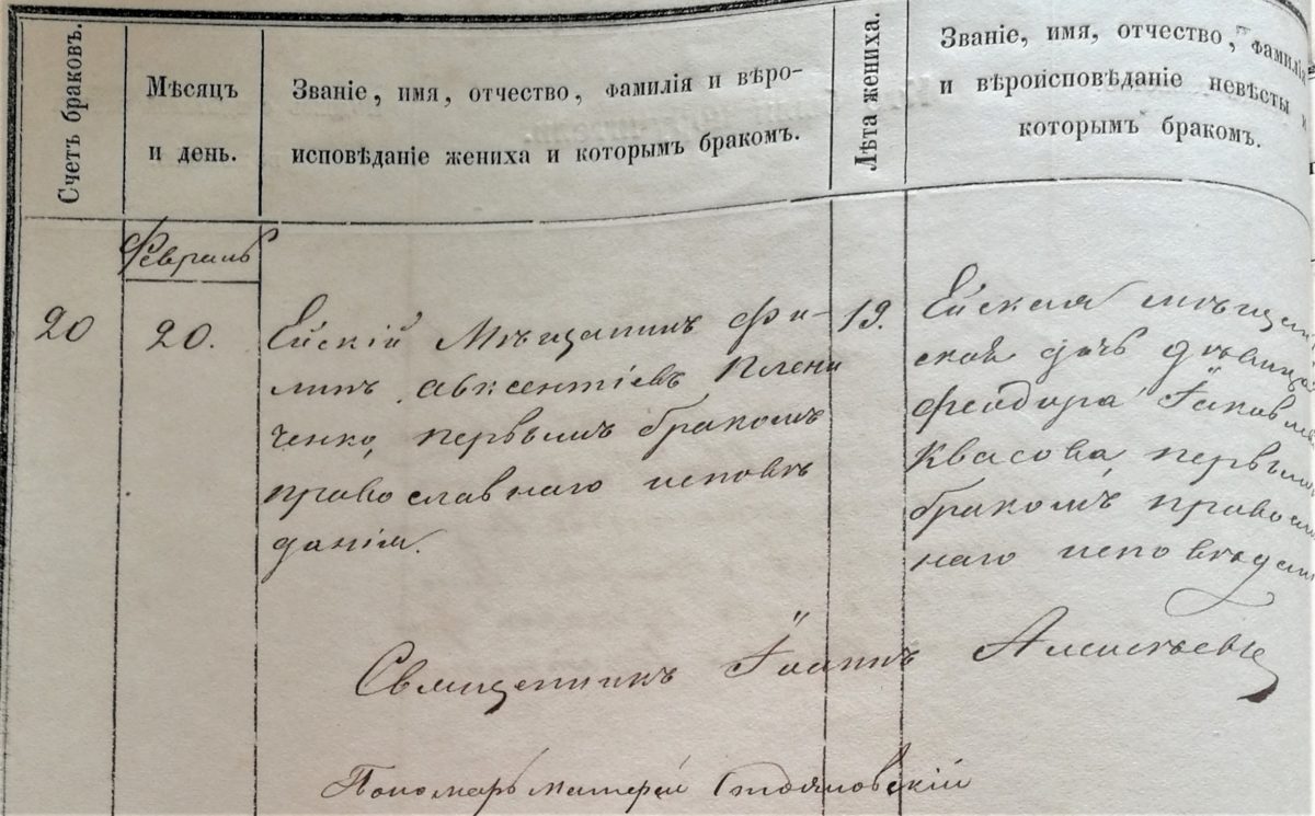 Ейский мещанин Филипп Авксентиев Плениченко и Мещанская дочь девица Феодора Яковлева Квасова, брак 1865 год