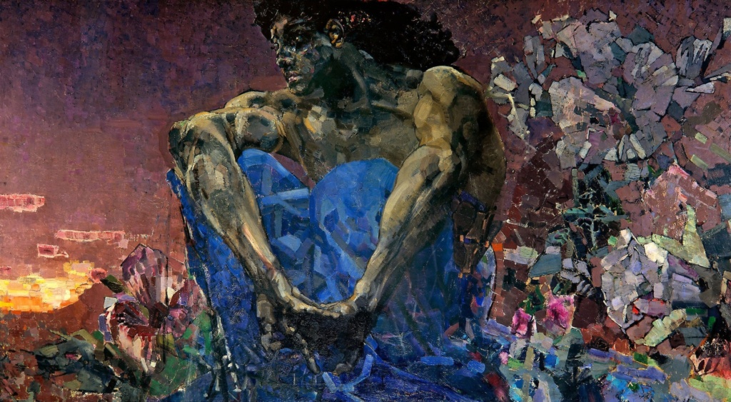 Меланхоличный «Демон» тоскует по живому миру. Окружающие его цветы — это холодные кристаллы, воспроизводящие изломы горных пород.