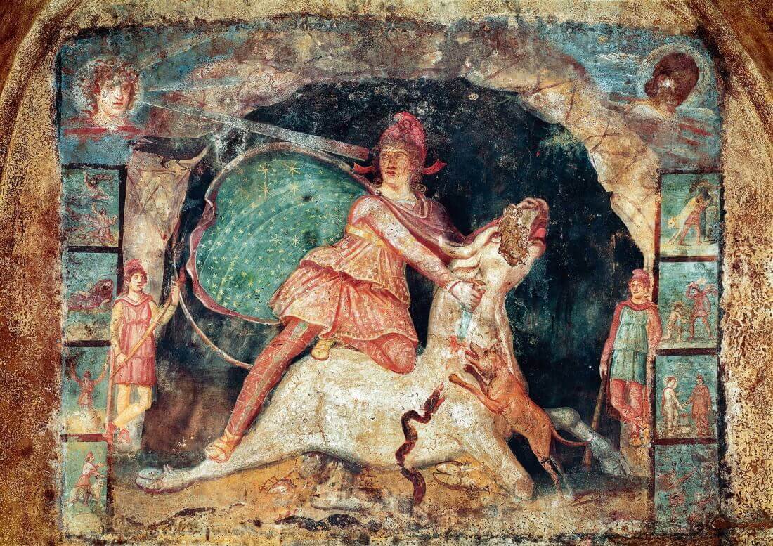 Митра убивает быка, III векФреска из митреума в Марино, Италия