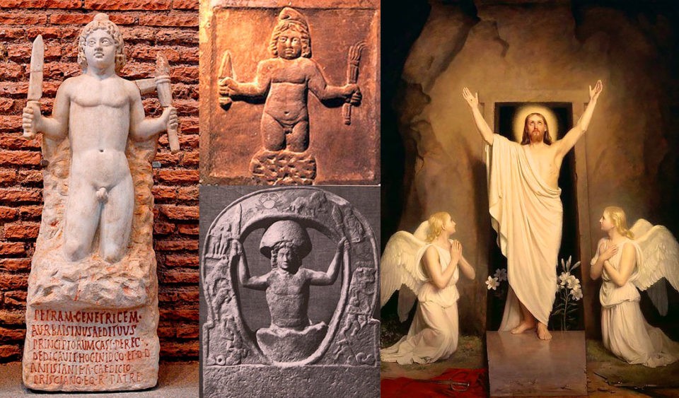 Слева — Митра, родившийся в пещере из скалы. Справа — Христос, воскресший в пещере, высеченной в скале.