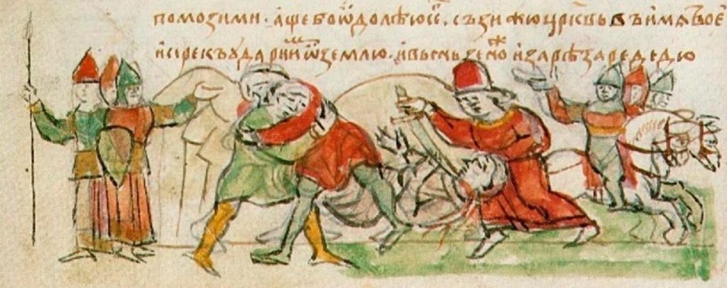 После поединка Мстислав убивает Редедю перед полками касожскими. Радзивилловская летопись.
