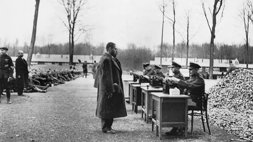 - Гестаповцы ведут запись данных о поступающих заключённых