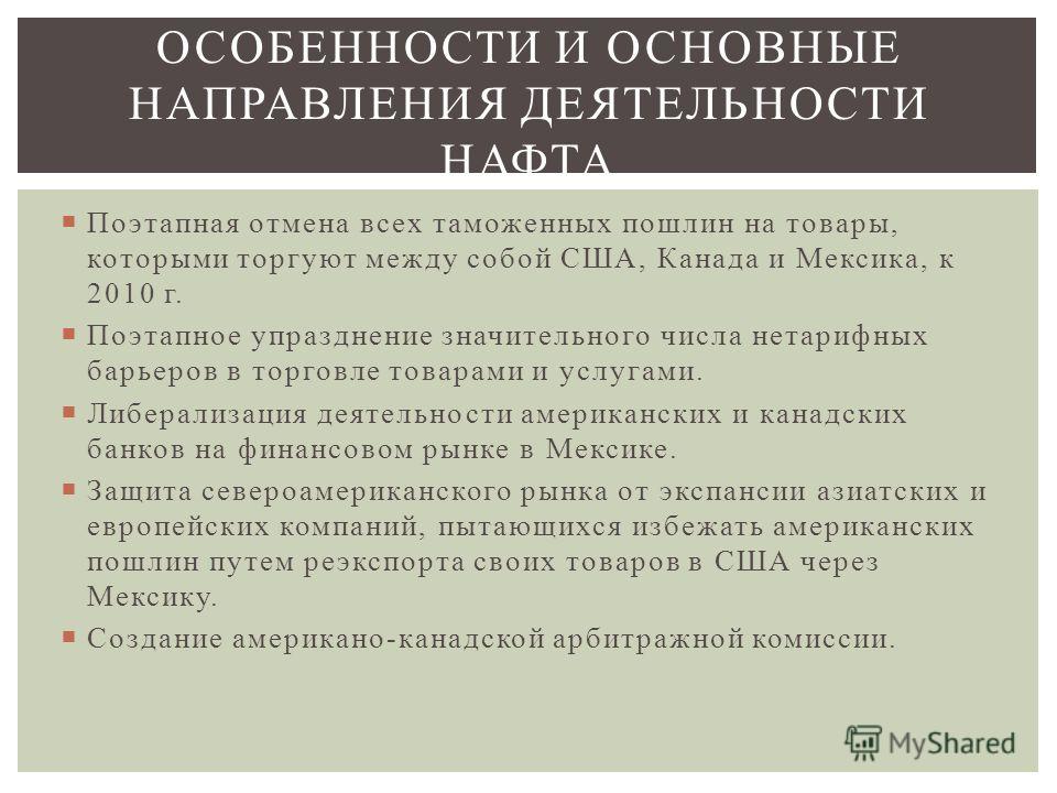 Поэтапная отмена всех таможенных пошлин на товары, которыми торгуют между собой США, Канада и Мексика, к 2010 г. Поэтапное упразднение значительного числа нетарифных барьеров в торговле товарами и услугами. Либерализация деятельности американских и канадских банков на финансовом рынке в Мексике. Защита североамериканского рынка от экспансии азиатских и европейских компаний, пытающихся избежать американских пошлин путем реэкспорта своих товаров в США через Мексику. Создание американо — канадской арбитражной комиссии. ОСОБЕННОСТИ И ОСНОВНЫЕ НАПРАВЛЕНИЯ ДЕЯТЕЛЬНОСТИ НАФТА