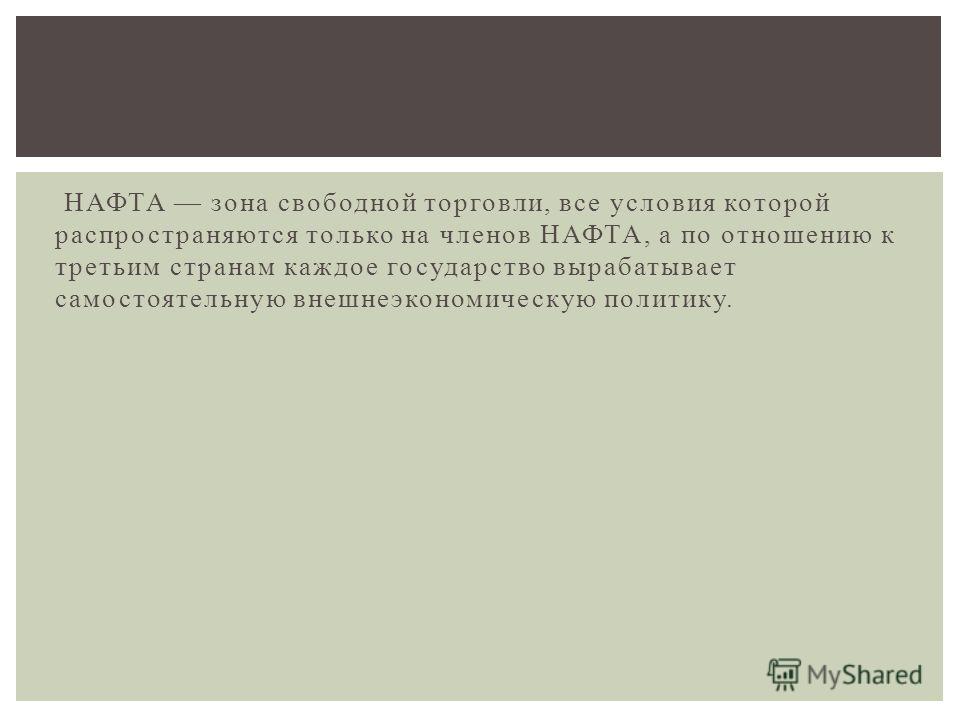 НАФТА зона свободной торговли, все условия которой распространяются только на членов НАФТА, а по отношению к третьим странам каждое государство вырабатывает самостоятельную внешнеэкономическую политику.