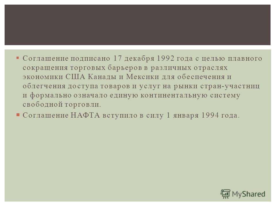 Соглашение подписано 17 декабря 1992 года с целью плавного сокращения торговых барьеров в различных отраслях экономики США Канады и Мексики для обеспечения и облегчения доступа товаров и услуг на рынки стран — участниц и формально означало единую континентальную систему свободной торговли. Соглашение НАФТА вступило в силу 1 января 1994 года.