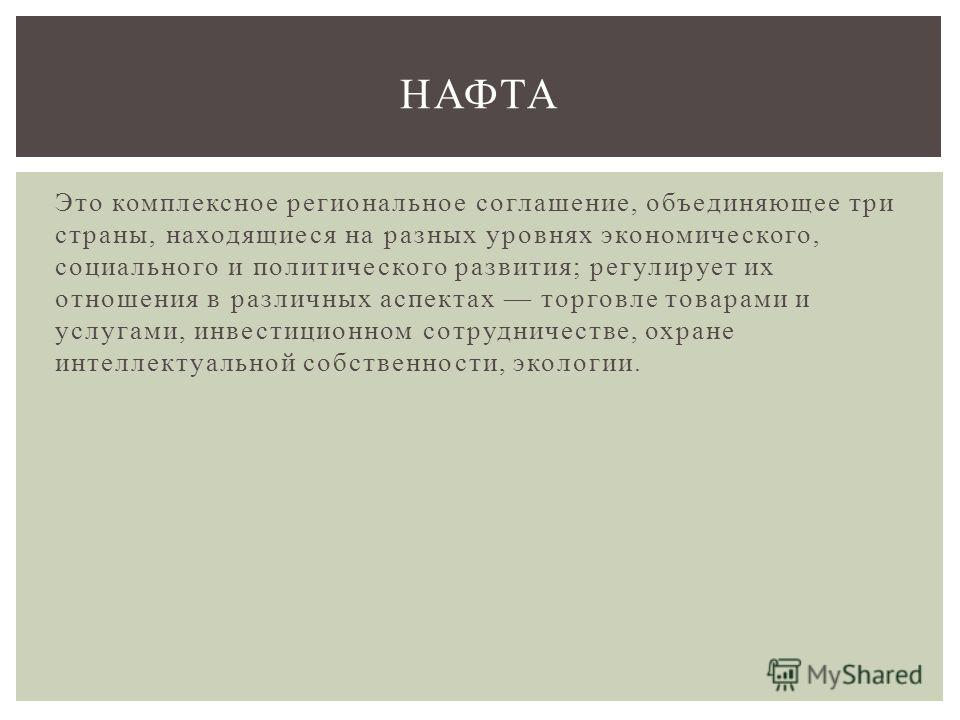 Это комплексное региональное соглашение, объединяющее три страны, находящиеся на разных уровнях экономического, социального и политического развития ; регулирует их отношения в различных аспектах торговле товарами и услугами, инвестиционном сотрудничестве, охране интеллектуальной собственности, экологии. НАФТА