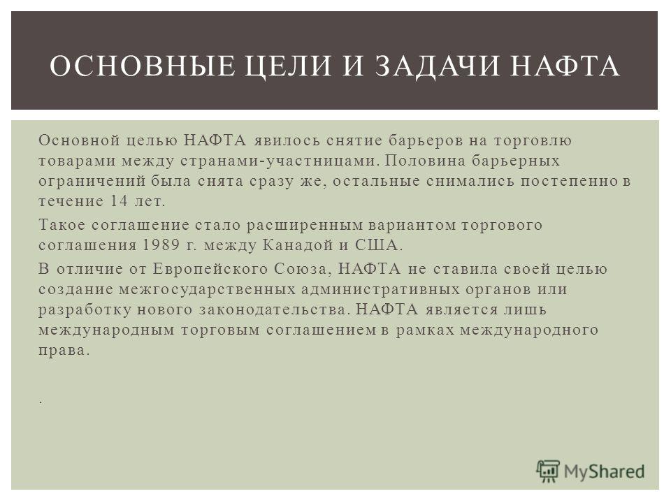 Основной целью НАФТА явилось снятие барьеров на торговлю товарами между странами — участницами. Половина барьерных ограничений была снята сразу же, остальные снимались постепенно в течение 14 лет. Такое соглашение стало расширенным вариантом торгового соглашения 1989 г. между Канадой и США. В отличие от Европейского Союза, НАФТА не ставила своей целью создание межгосударственных административных органов или разработку нового законодательства. НАФТА является лишь международным торговым соглашением в рамках международного права.. ОСНОВНЫЕ ЦЕЛИ И ЗАДАЧИ НАФТА