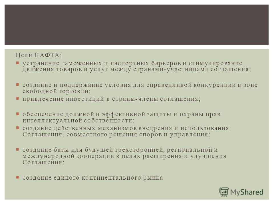 Цели НАФТА : устранение таможенных и паспортных барьеров и стимулирование движения товаров и услуг между странами — участницами соглашения ; создание и поддержание условия для справедливой конкуренции в зоне свободной торговли ; привлечение инвестиций в страны — члены соглашения ; обеспечение должной и эффективной защиты и охраны прав интеллектуальной собственности ; создание действенных механизмов внедрения и использования Соглашения, совместного решения споров и управления ; создание базы для будущей трёхсторонней, региональной и международной кооперации в целях расширения и улучшения Соглашения ; создание единого континентального рынка