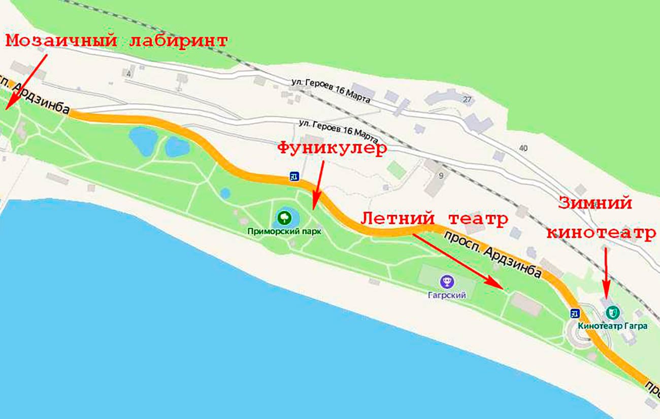- Приморский парк: Мозаичный лабиринт – Фуникулер – Летний театр – Кинотеатр «Гагра».