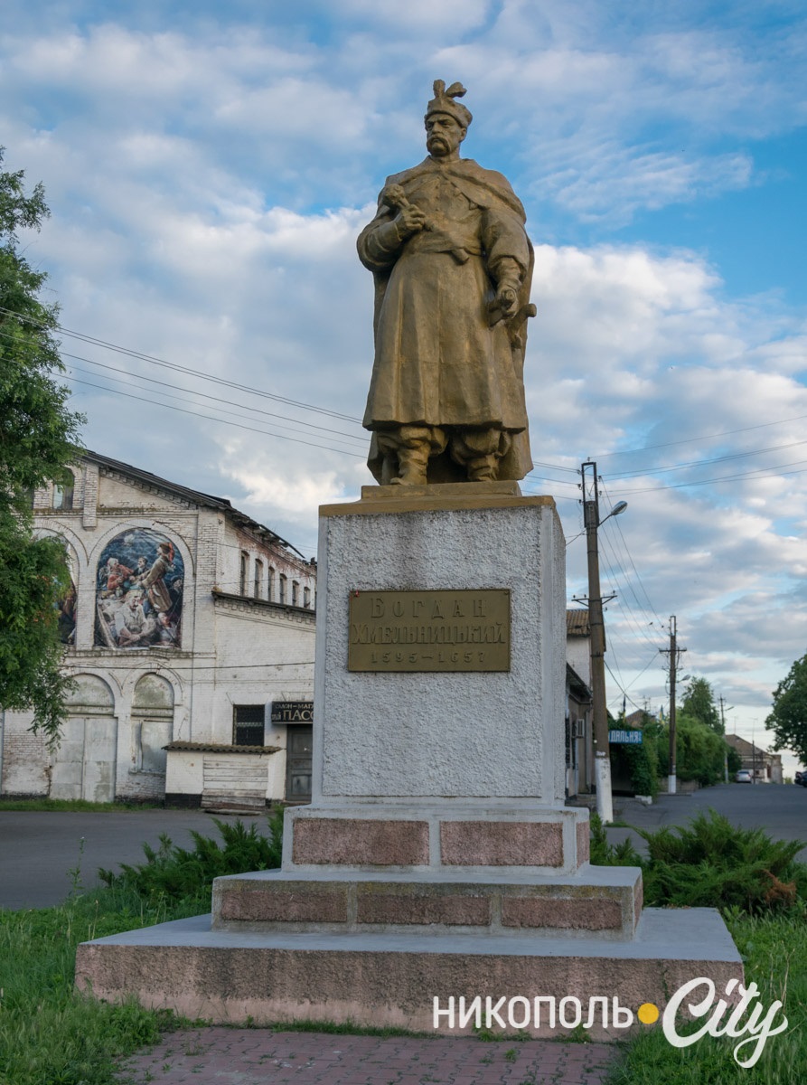 Никополь считается центром казачества. На этих землях в 1648 году казаками был избран первый гетман Украины Богдман Хмельницкий. В честь этих событий в 50-х годах установили памятник Хмельницкому и неподалеку от него пилон с мемориальной доской.