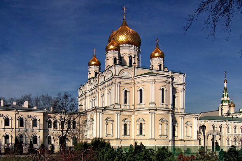 Жемчужина Новодевичьей лавры возводилась на протяжении 12 лет под руководством Н. Е. Ефимова. Это двухэтажное здание с пятью позолоченными куполами, под которыми спрятаны звонницы. С двух сторон фасад оформлен колоннами, главный вход украшен арочным порталом, барабаны несколько удлинены – все это указывает на влияние византийской архитектуры. Внутри собора возвышается полукруглый пятиярусный иконостас. Вся храмовая роспись принадлежит кистям монастырских художников и насельниц.