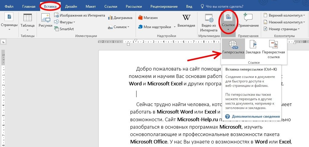 - Установите курсор на место в документе, куда нужно вставить ссылку или выделите выражение, которое будет служить ссылкой.
