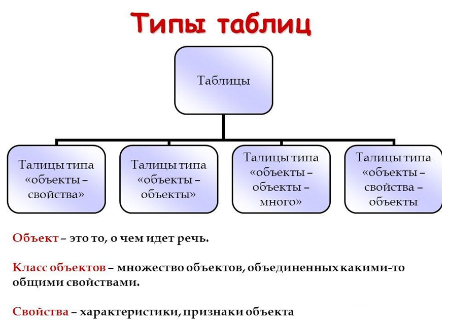 Объекты, представленные таблично, имеют общие свойства, но не обязательно все, для систематизации достаточно одного общего параметра.