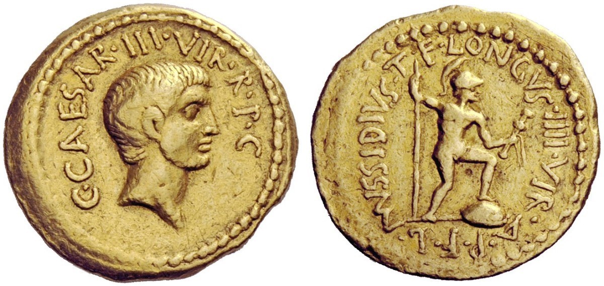 Золотой Аурелей. 42. Г. до н.э. Монетный Двор: Рим. Гай Цезарь (Октавиан) консул 43 г. до н. э., триумвир 43—33 гг. до н. э. Луций Муссидий Лонг, монетарий 42 г. до н. э.