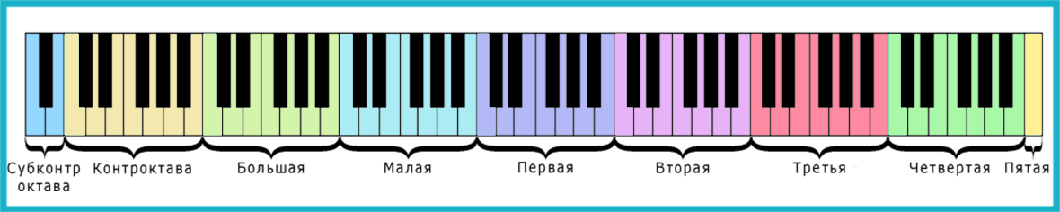 Каждый музыкальный инструмент, а также человеческий голос, может звучать предельно низко и предельно высоко в рамках своих возможностей. Расстояние от самого низкого, до самого высокого звука называется диапазоном. Музыкальный диапазон измеряют октавами. Эта величина охватывает весь звукоряд из 7 нот, должно быть поэтому ее выбрали мерой. В музыке используют 9 октав, каждая из которых имеет свое название. Нагляднее всего будет показать их на клавиатуре фортепиано, которая содержит 7 полных и 2 неполных октавы: