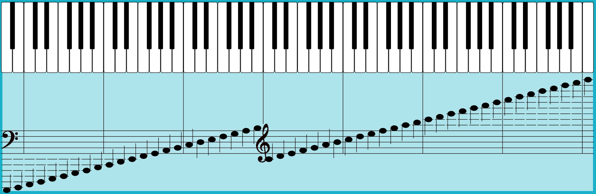 88-клавишное фортепиано с пронумерованными октавами и выделенными буквами (голубой) и A440 (желтый)