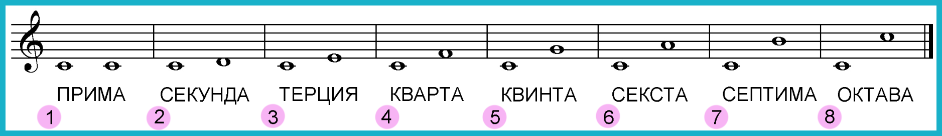 Интервал имеет основание и вершину. Расстояние между ними можно посчитать ступенями или количеством тоно́в. Названия интервалов происходят от латинских порядковых числительных. Например, расстояние от основания до вершины в две ступени называется секундой, а в пять ступеней – квинтой. Также, каждый интервал обозначается арабской цифрой: