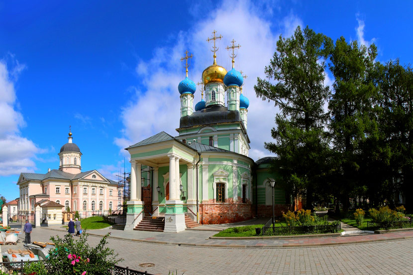 Первым гости монастыря видят храм Всех Святых, расположенный за оградой монастыря – был на монастырском кладбище, разрушен после революции и сейчас полностью восстановлен.