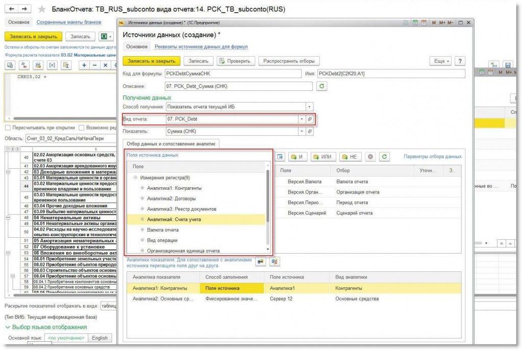 Поддерживает работу с любым регистром бухгалтерии. В одном отчете можно использовать источники из разных регистров. В качестве показателей могут выступать любые ресурсы регистров бухгалтерии (не только «Сумма»).