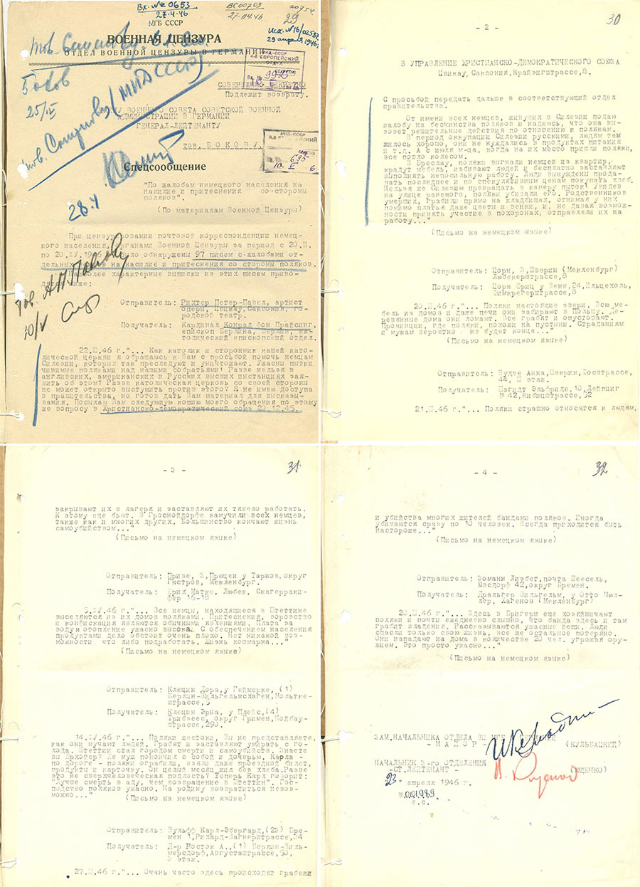 Наряду с донесениями официальных лиц о бедственном положении переселенцев, РВИО обнародовало и документы с выдержками из писем самих немцев, которые в то время собирались органами военной цензуры в Германии. Согласно их данным, только с марта по апрель 1946 года были зафиксированы 97 писем с жалобами немецких граждан, выдворенных из Польши, на насилие и притеснение со стороны поляков.