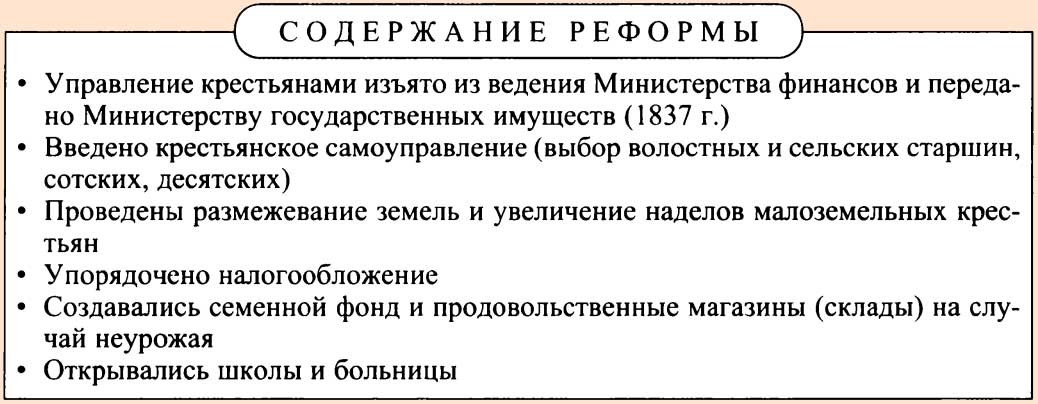 | 3 этап: 1840-1841 годы | Реформа добралась до деревень. Созданы органы местного управления (волостной сход, уездный сход, правление, расправа). | Теоретически в деревне началось самоуправление, но практически вся власть находилась у Министерства госимущества. |