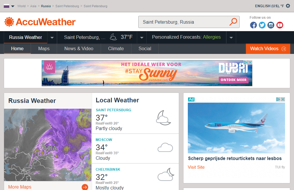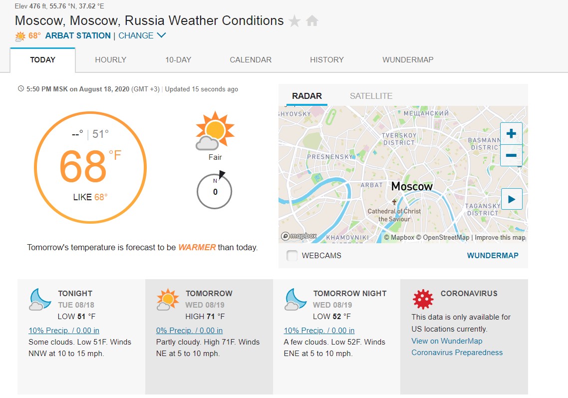 Это американский сайт, который подскажет пользователю температуру и погоду на улице. Неудобство заключается в том, что сайт адаптирован под англоязычную аудиторию, а также все температурные явления предоставлены пользователю в фаренгейтах, а не в привычных градусах.